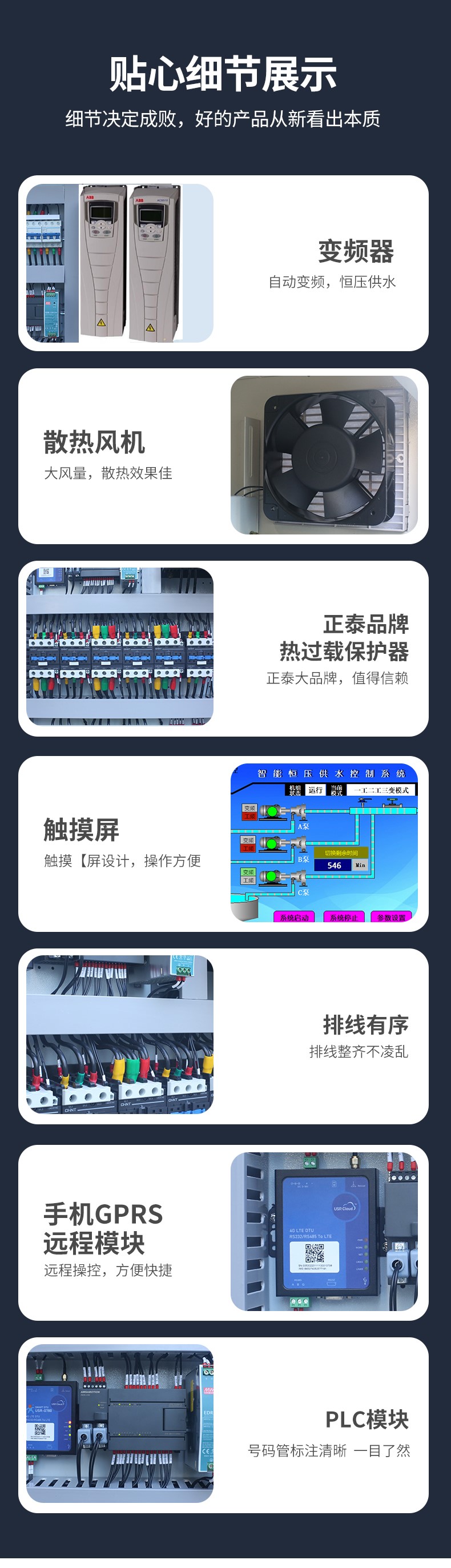 支持多種控制模式(如液位、壓力、溫度、時間控制),具備自動巡檢、故障記憶、遠程監控、定時換泵、小流量休眠等功能,減少人工干預,實現無人值守 。